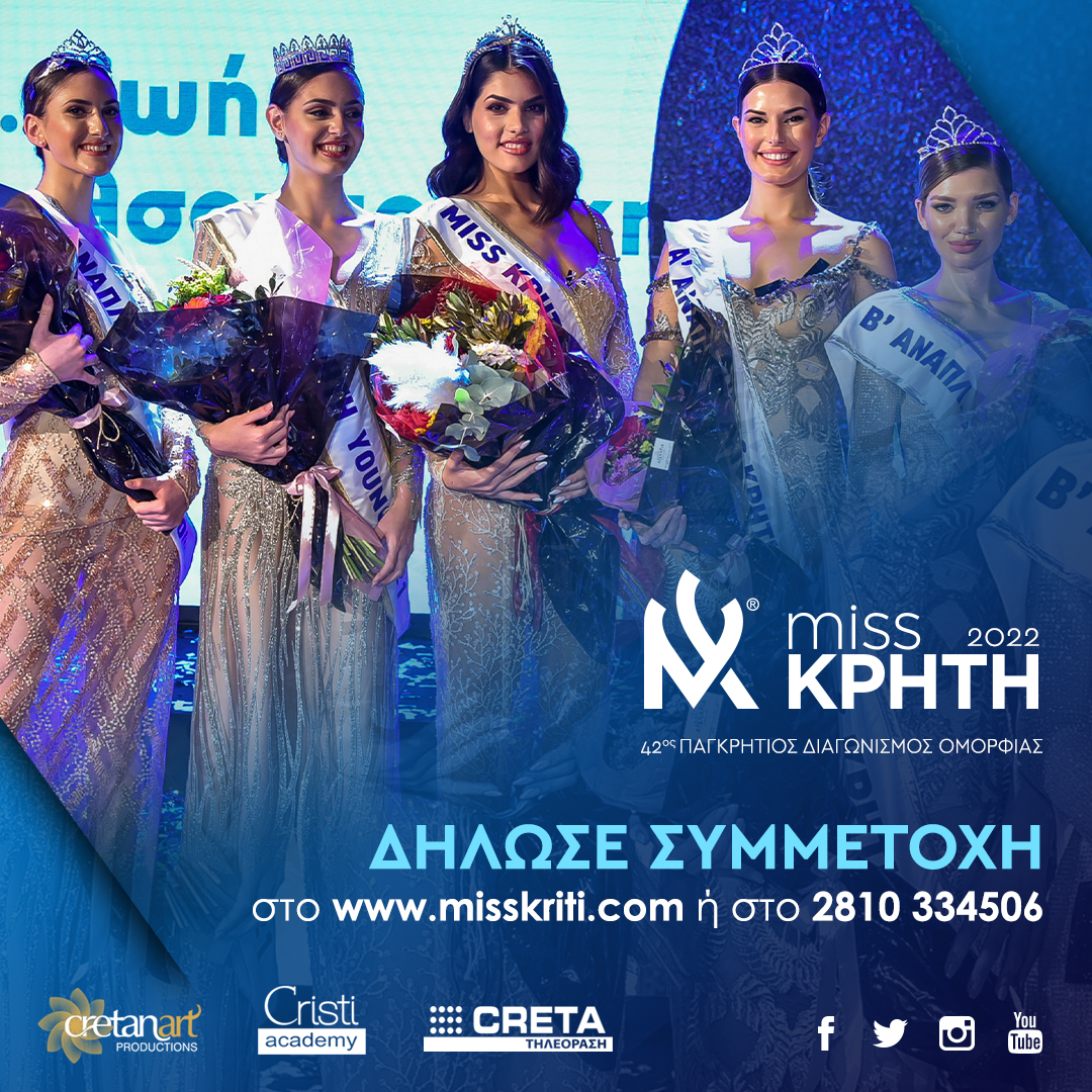 Έτσι λοιπόν, ο μεγαλύτερος περιφερειακός θεσμός ομορφιάς προσκαλεί κοπέλες από 16 έως 26 ετών να δηλώσουν συμμετοχή στον 42ο Παγκρήτιο Διαγωνισμό Ομορφιάς και να διεκδικήσουν τους τίτλους της Miss Κρήτη, των δύο Αναπληρωματικών και της Miss Κρήτη Young 2022!