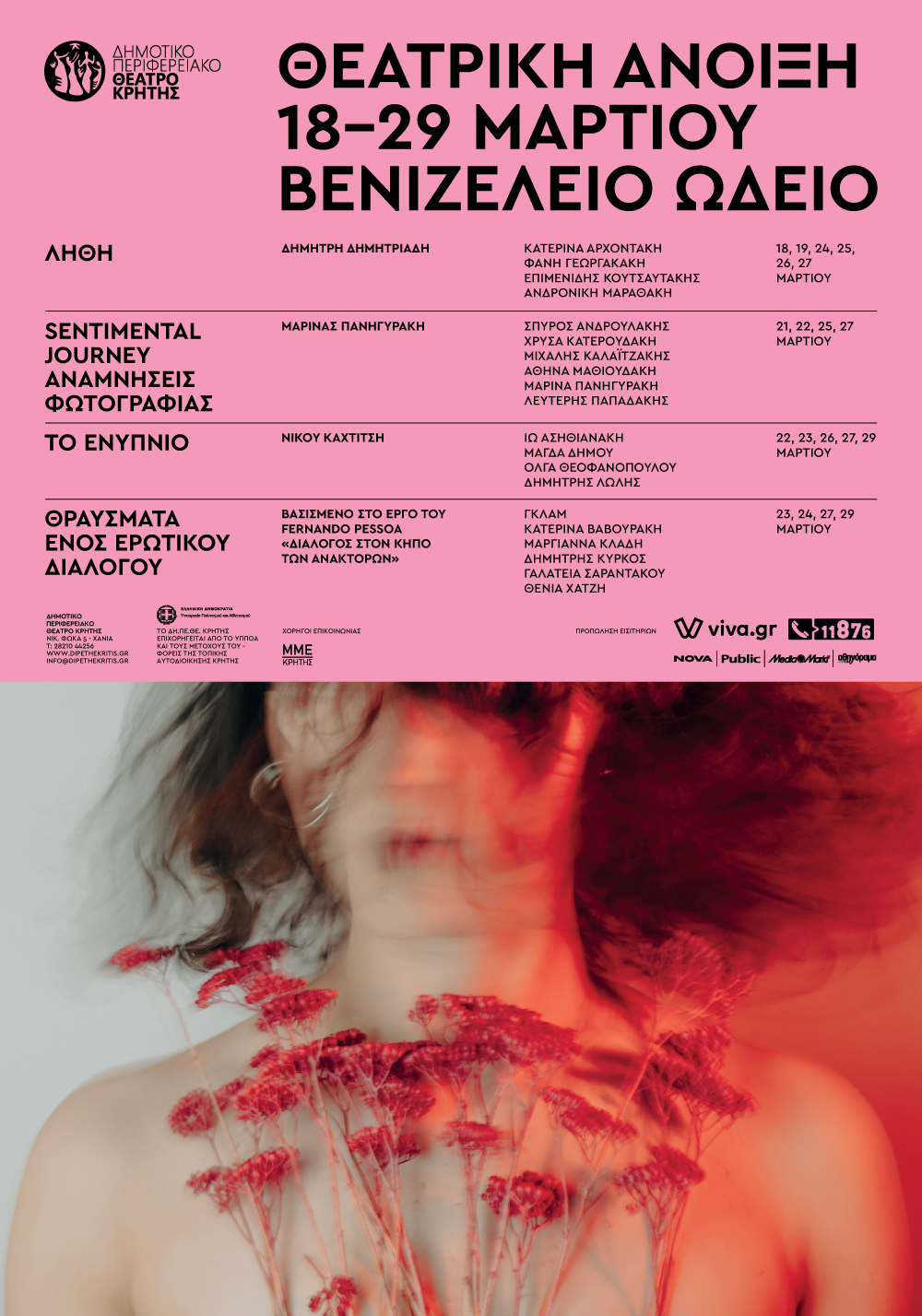 Το Δημοτικό Περιφερειακό Θέατρο Κρήτης γίνεται φέτος την άνοιξη ένας τόπος συνάντησης και δημιουργίας καλλιτεχνικών δυνάμεων της πόλης. Ανεξάρτητοι καλλιτέχνες και καλλιτεχνικές ομάδες που ζουν και δημιουργούν στα Χανιά, συνυπάρχουν για δώδεκα μέρες στη σκηνή του Βενιζέλειου Ωδείου, παρουσιάζοντας σε εναλλασσόμενο ρεπερτόριο, κείμενα καταξιωμένων συγγραφέων, αλλά και σύγχρονα έργα, με θέματα τον έρωτα, τη μνήμη, το όνειρο, τη φθορά.