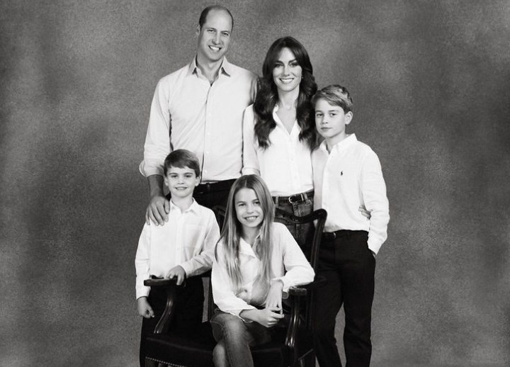 Η ασπρόμαυρη φωτογραφία που επέλεξαν ο πρίγκιπας Γουίλιαμ και η Κέιτ Μίντλετον δείχνει το ζευγάρι να χαμογελά έχοντας στο πλευρό τους τους γιους τους πρίγκιπα Τζορτζ και πρίγκιπα Λουίς ενώ η πριγκίπισσα Σάρλοτ κάθεται σε μια καρέκλα μπροστά τους.