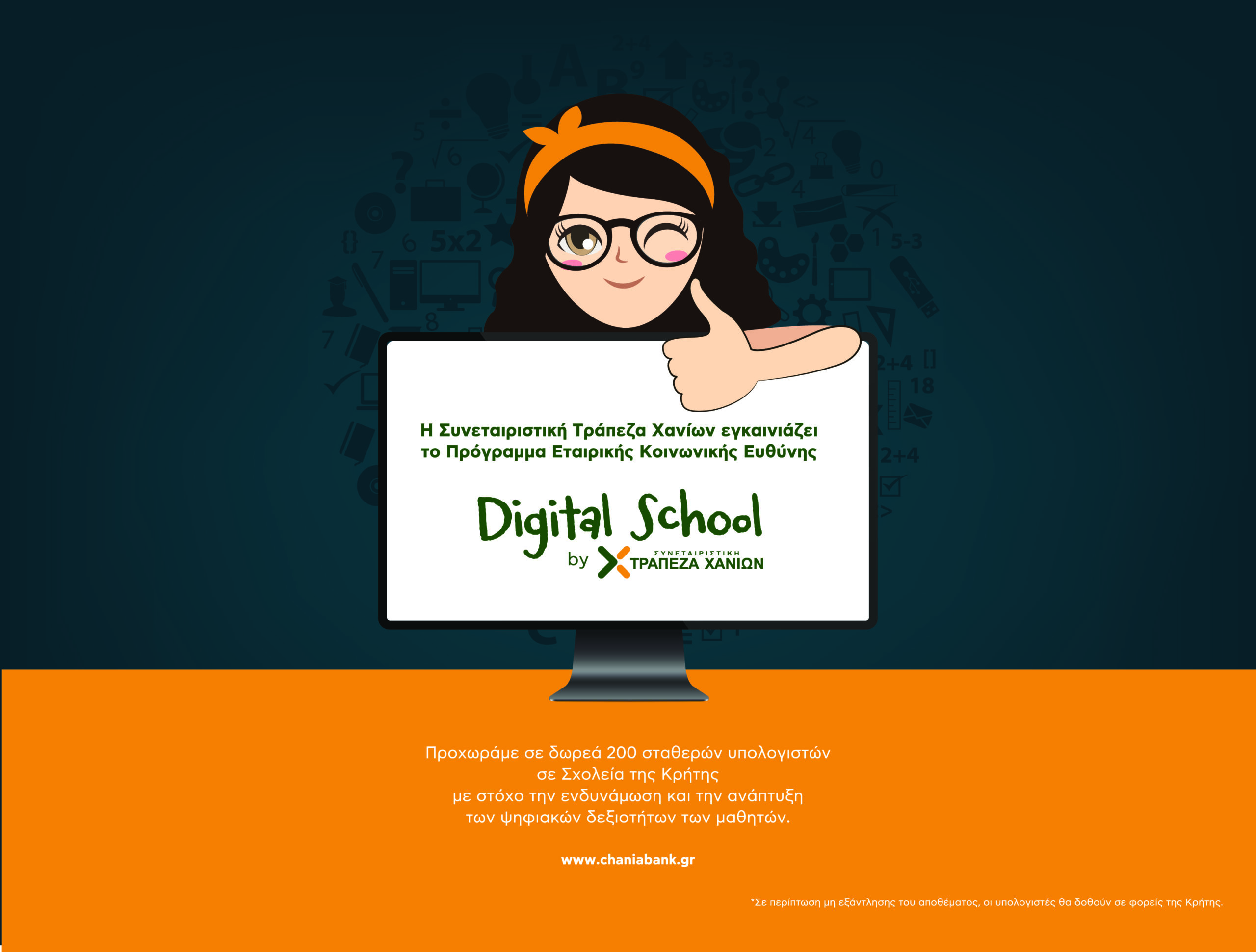 Σε αυτή την κατεύθυνση, υλοποιεί το πρόγραμμα «Digital School by Τράπεζα Χανίων». Το πρόγραμμα αφοράτη δωρεά ψηφιακού εξοπλισμού για τον ευρύτερο εκσυγχρονισμό των ελληνικών σχολείων μέσω της προώθησης νέων και καινοτόμων μεθόδων εκμάθησης που θα συμβάλλουν στη διαδραστική συμμετοχή των μαθητών στη διδασκαλία, ενδυναμώνοντας ταυτόχρονα την ανάπτυξη των ψηφιακών δεξιοτήτων τους.