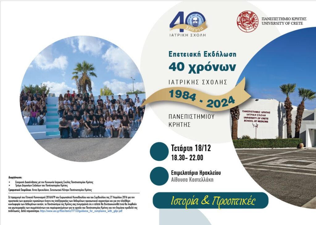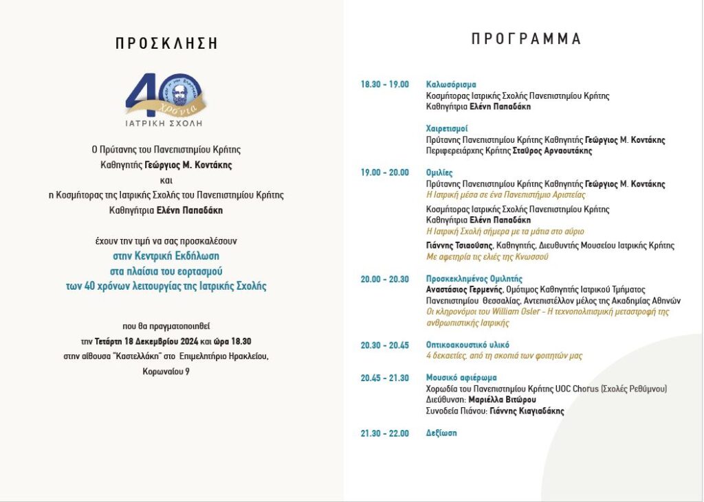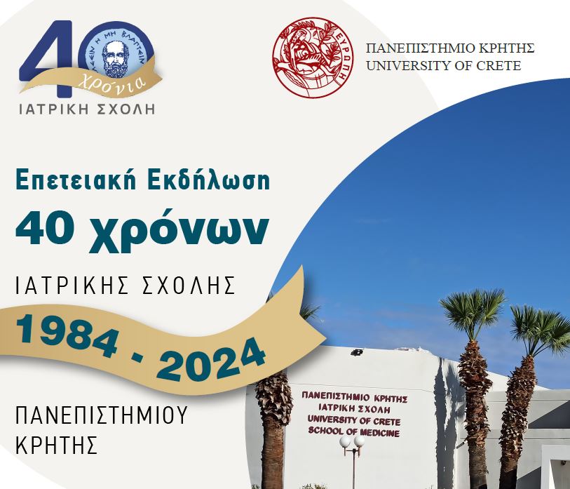 Η Ιατρική Σχολή του Πανεπιστημίου Κρήτης πραγματοποιεί την κεντρική εκδήλωση για τον εορτασμό των 40 χρόνων λειτουργίας της, την Τετάρτη 18 Δεκεμβρίου 2024, 18.30 έως 22.00, στην αίθουσα «Καστελλάκη» του Επιμελητήριου Ηρακλείου.
