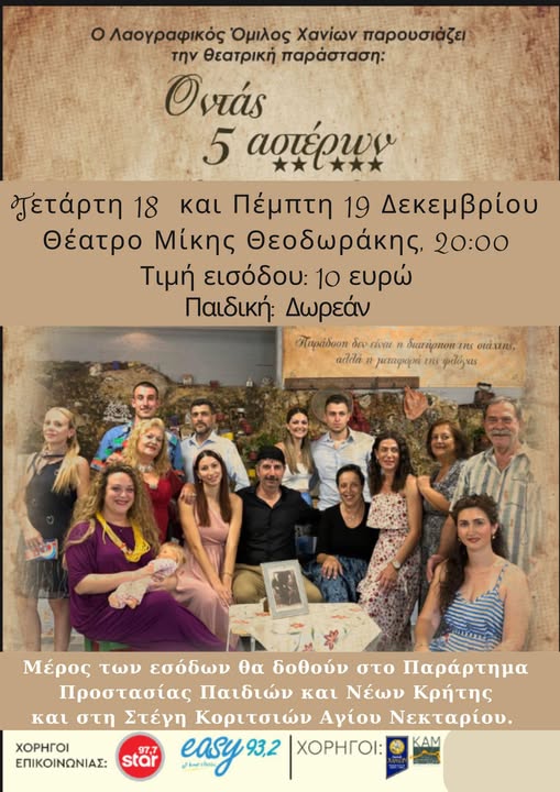 Είσοδος 10€ (μειωμένο 5€) για την ενίσχυση του παραρτήματος Προστασίας Παιδιών και Νέων Κρήτης και την Στέγη Κοριτσιών Αγίου Νεκταρίου.