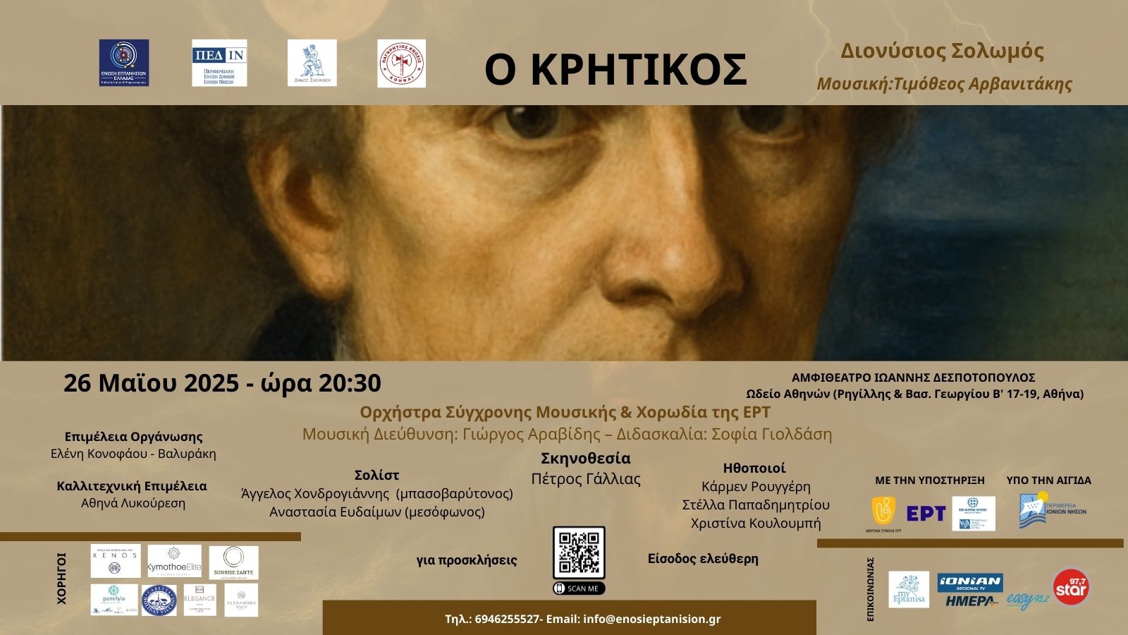 Μέσα από το σολωμικό αριστούργημα, η Κρήτη και τα Επτάνησα — δύο νησιωτικοί κόσμοι σε αμοιβαίο πνευματικό διάλογο — συνομιλούν ποιητικά, ανταλλάσσοντας μνήμες, αξίες και οράματα. Η παράσταση «Ο Κρητικός» είναι κάτι περισσότερο από μια μουσική βραδιά, είναι ένα σύμβολο ενότητας, αντίστασης και πολιτισμικής ταυτότητας.