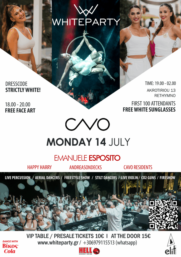 Με σκηνικά, κοστούμια και αμέτρητα highlights σε ολόλευκο φόντο, το White Party υπόσχεται να μας χαρίσει μία αξέχαστη εμπειρία στο CAVO, RETHYMNO.