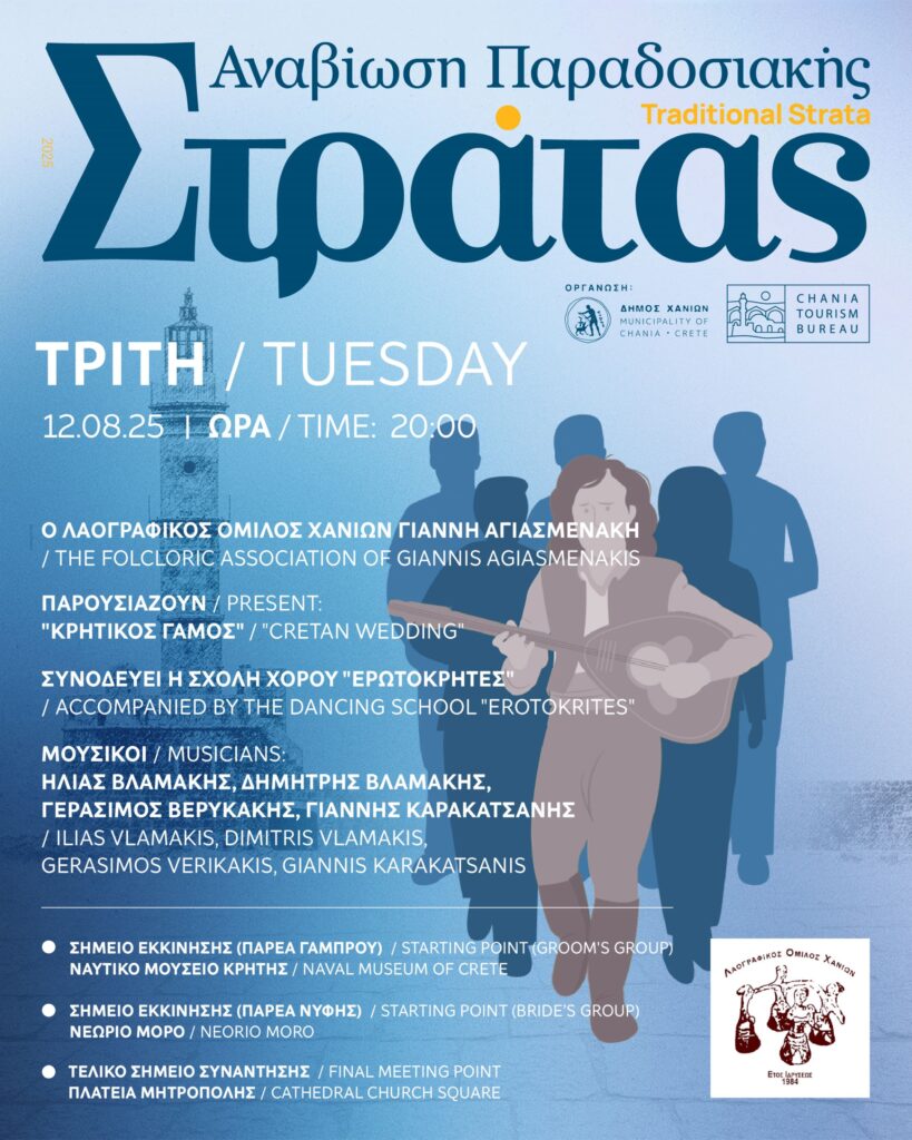 Αύριο, Τρίτη 12/08/2025, ο Λαογραφικός Όμιλος Χανίων Γιάννης Αγιασμενάκης μαζί με την παραδοσιακή σχολή χορού «ΕΡΩΤΟΚΡΗΤΕΣ» θα παρουσιάσουν το δρώμενο: «Κρητικός Γάμος». Συνοδεύονται από τους μουσικούς: Ηλία Βλαμάκη, Δημήτρη Βλαμάκη, Γεράσιμο Βερυκάκη και Γιάννη Καρακατσάνη.