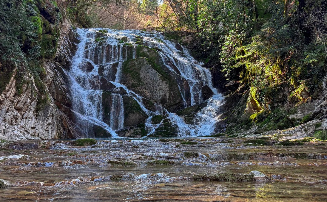 Και τότε, στρίβοντας σε μια καμπή του μονοπατιού, αντικρίζουμε το αποκορύφωμα της διαδρομής: έναν ιδιότυπο καταρράκτη όπου τα νερά δεν πέφτουν κάθετα, αλλά απλώνονται σαν ένα υδάτινο πέπλο πάνω στην επιφάνεια ενός τεράστιου βράχου, δημιουργώντας μια εικόνα που κόβει την ανάσα. Το νερό κυλά διαγώνια στη λεία επιφάνεια του βράχου, αντανακλώντας το φως και δημιουργώντας αμέτρητες λαμπερές ψηφίδες σε μια συνεχώς μεταβαλλόμενη υδάτινη μωσαϊκό.