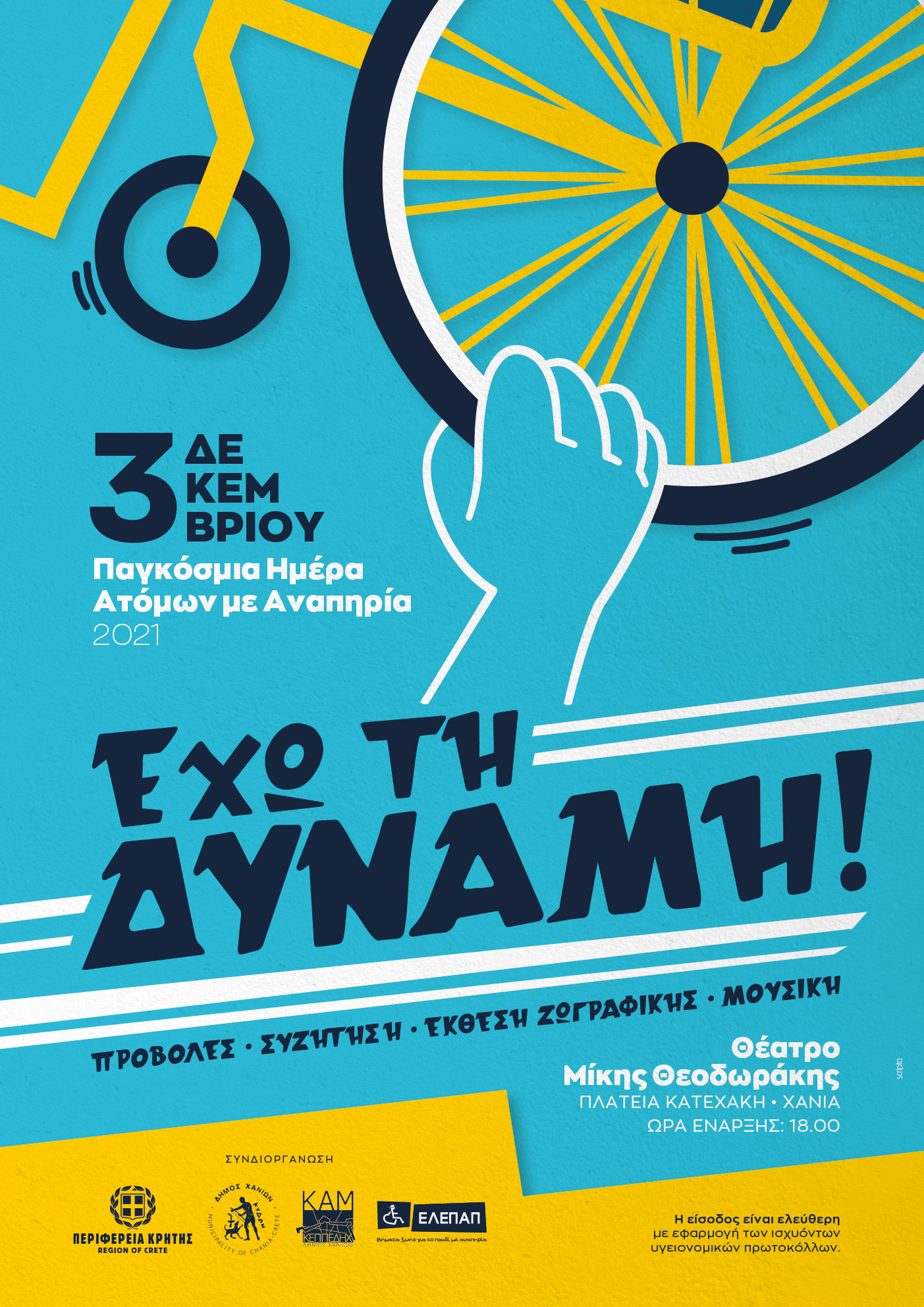 Η Περιφέρεια Κρήτης – Περιφερειακή Ενότητα Χανίων, στο πλαίσιο του κύκλου των δράσεων «Μέσα κι έξω από την τάξη. Προβλήματα και Συγκρούσεις» που διοργανώνει κάθε χρόνο, συνδιοργανώνει με τον Δήμο Χανίων, την ΚΕΠΠΕΔΗΧ- ΚΑΜ και την ΕΛΕΠΑΠ Χανίων και με αφορμή την Παγκόσμια Ημέρα Ατόμων με Αναπηρία, εκδήλωση με τίτλο: