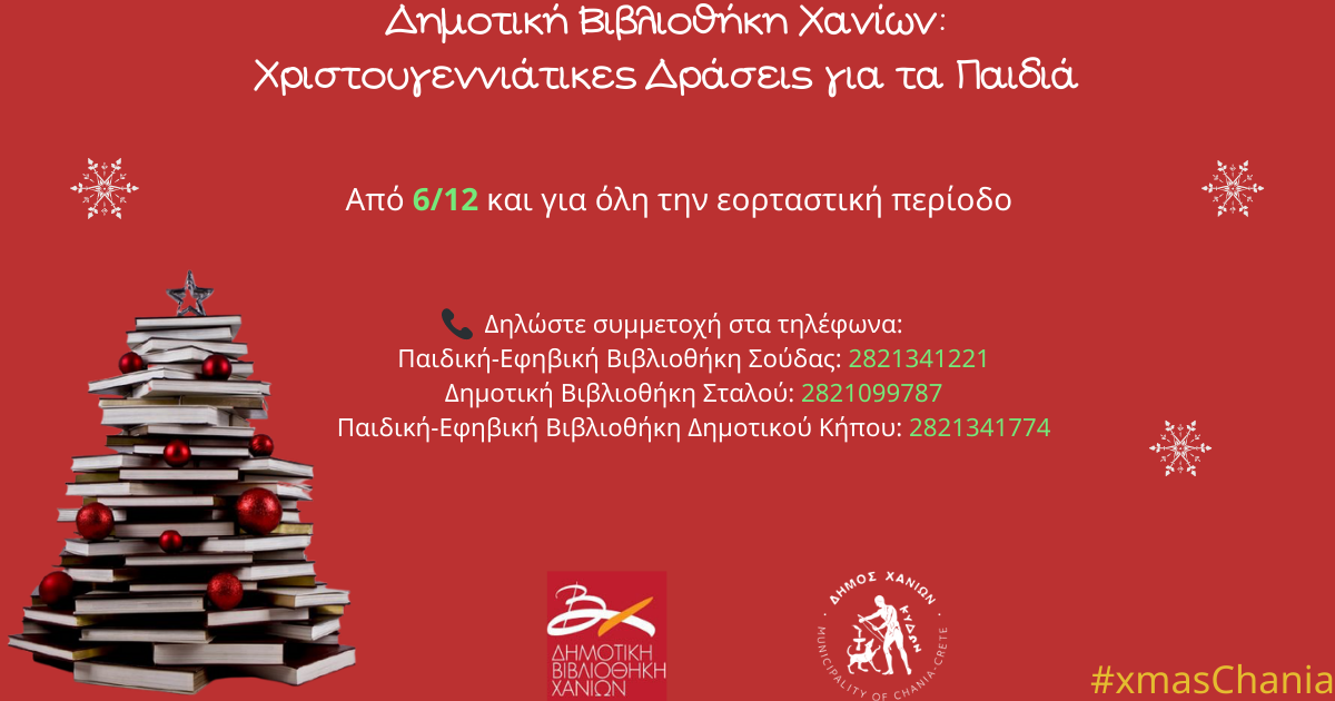 Η Δημοτική Βιβλιοθήκη Χανίων πραγματοποιεί εκδηλώσεις στο πλαίσιο των εορτών των Χριστουγέννων, καλώντας τους μικρούς μας φίλους να συμμετέχουν στη μεγαλύτερη γιορτή του χρόνου.
