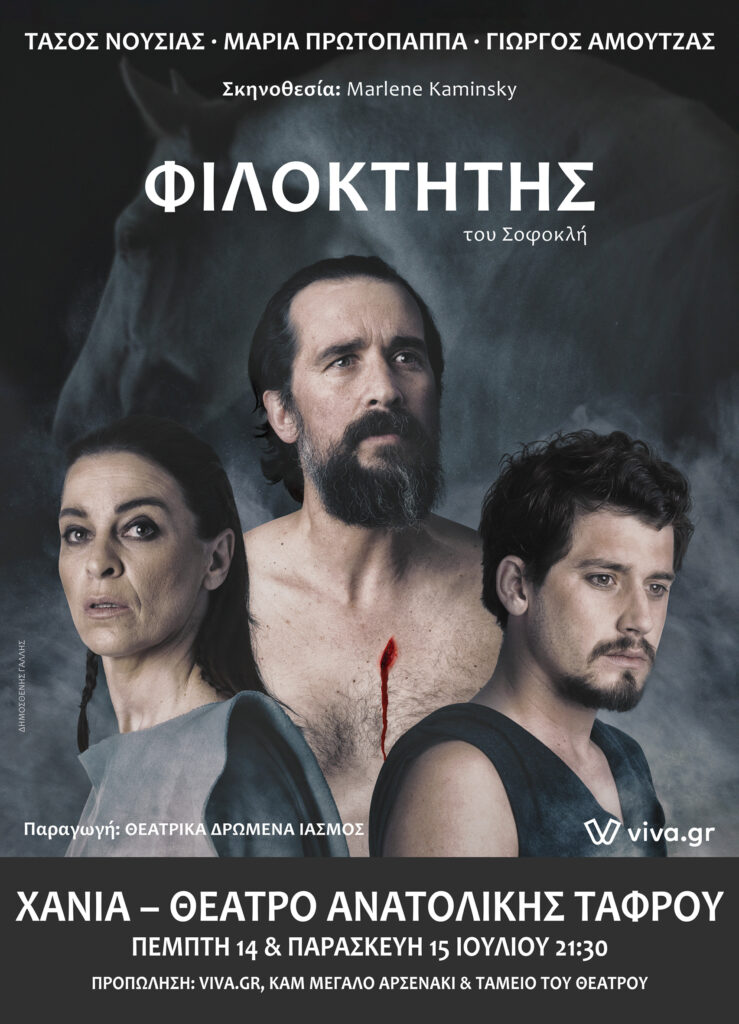 Τα Θεατρικά Δρώμενα «ΙΑΣΜΟΣ» θα παρουσιάσουν το Καλοκαίρι του 2022 την τραγωδία του Σοφοκλή «Φιλοκτήτης» σε επιλεγμένα θέατρα και Φεστιβάλ της Ελλάδας & της Κύπρου. Τον απαιτητικό ρόλο του πληγωμένου ομώνυμου ήρωα ερμηνεύει ο Τάσος Νούσιας, αυτόν του φιλόδοξου Νεοπτόλεμου αναλαμβάνει ο πολλά υποσχόμενος Γιώργος Αμούτζας, ενώ στον ρόλο-πρόκληση του πολυμήχανου Οδυσσέα βρίσκουμε την Μαρία Πρωτόπαππα. Μαζί τους ένας 6μελής χορός ταλαντούχων ηθοποιών.